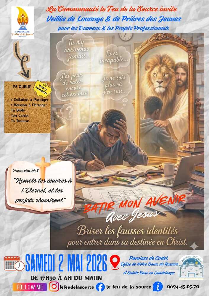 Samedi02/0517h30>Dimanche03/0506h00Veillée de louange et de Prière des Examens