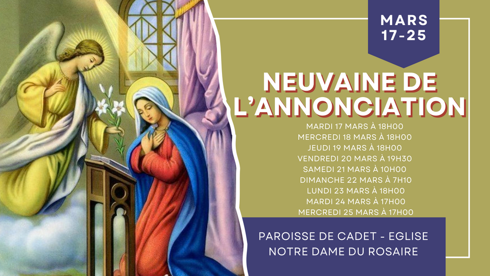 Responsable Michel PETIPERMON Présentation Agenda Actualité Mardi 17/03 > Mercredi 25/03 Neuvaine de l'Annonciation Cadet Evènement/Activité Paroisse de Cadet Vendredi 20/03 18h00 Temps de méditation carême Cadet Evènement/Activité Aucune actualité