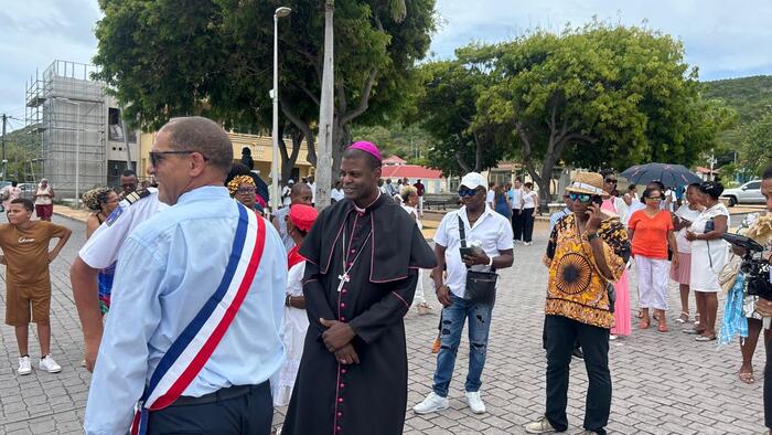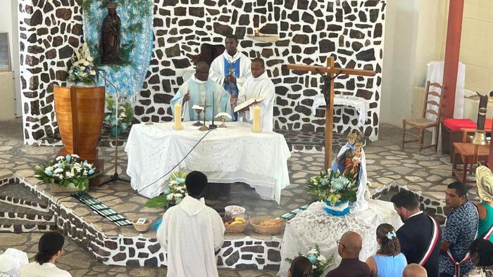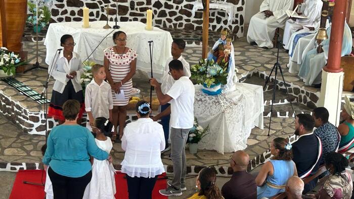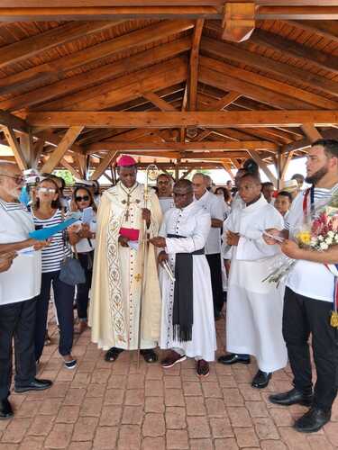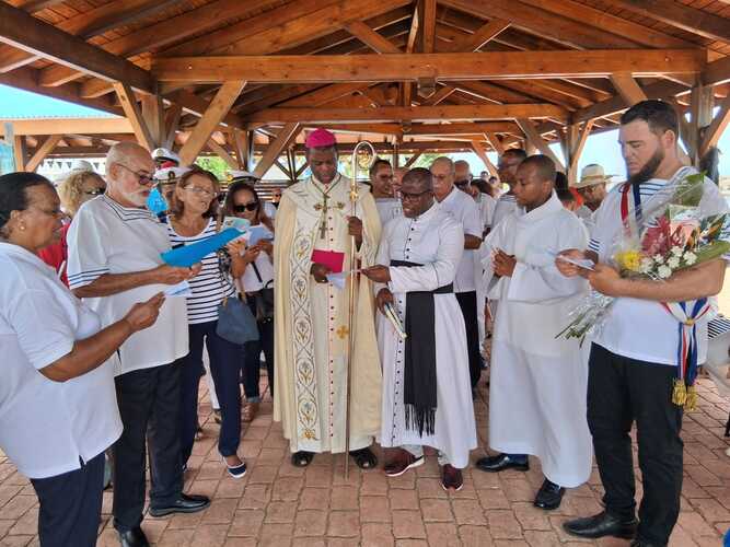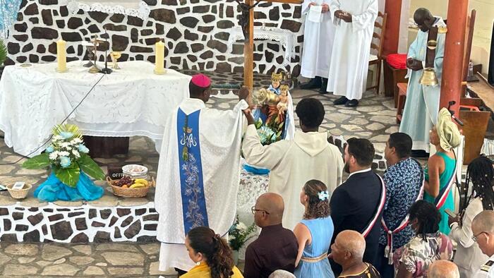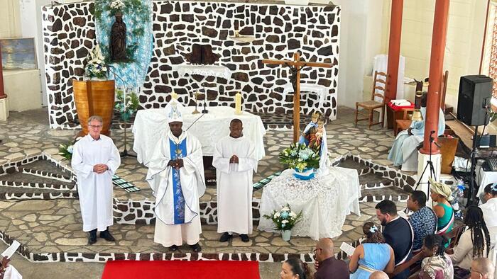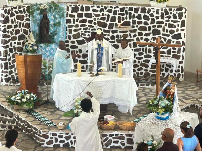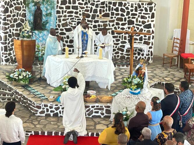 Pour ce grand événement liturgique de dévotion mariale, Mgr Philippe GUIOUGOU, évêque de Guadeloupe s’est rendu sur place durant 3 jours, en visite pastorale. Le pasteur de notre diocèse a présidé aux côtés du curé de la localité, Père Honoré NKOUNKOU, la messe solennelle du 15 août, en présence du maire Loïc TONTON, de la municipalité, de plusieurs élus, des autorités civiles et de nombreux fidèles. Précédemment, le jeudi soir, Mgr Philippe avait conféré le sacrement de la confirmation à une quinzaine de jeunes ados de la localité, lors de la célébration eucharistique qu’il a également présidé à l’église du bourg.