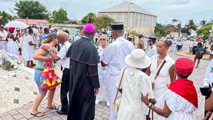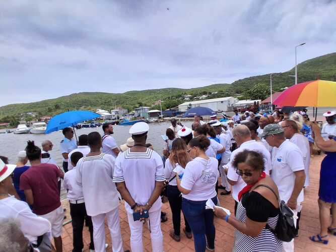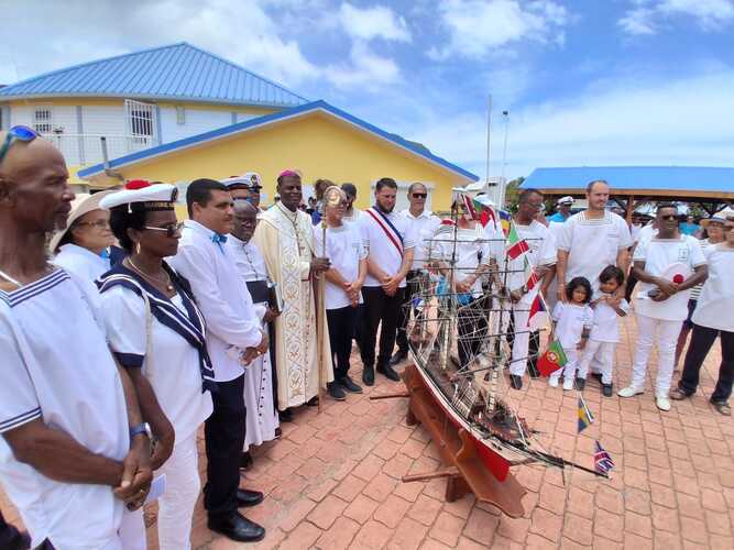 Moment d’émotion à l’issue de cette messe des marins, lorsque la chorale entonna le chant « Au secours, Vierge Marie » (voir les paroles ci-dessous). Après ce chant, Mgr Philippe s’adressant à l’assemblée des fidèles confia s’être rendu au monument aux morts de l’île. « J’ai vu les noms des marins défunts. Beaucoup sont décédés très jeunes. La plupart, dans la force de l’âge, ont perdu leur vie et ce chant m’a fait penser à ces marins qui peut-être dans cette tempête se sont tournés vers la Vierge Marie. Peut-être qu’ils ont chanté ce chant, au secours, viens sauver mes jours. Cela m’a beaucoup touché » a avoué l’évêque de Guadeloupe, demandant à la chorale de reprendre ce chant a capella, en se tournant vers la Vierge Marie. Après quoi, toute l’assemblée est partie en procession dans les rues du bourg, vers le port pour la bénédiction de la mer et l’hommage aux marins-pêcheurs décédés.