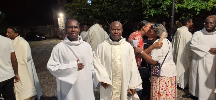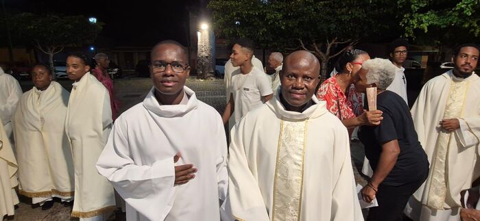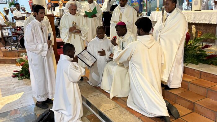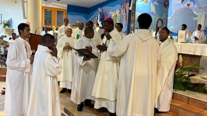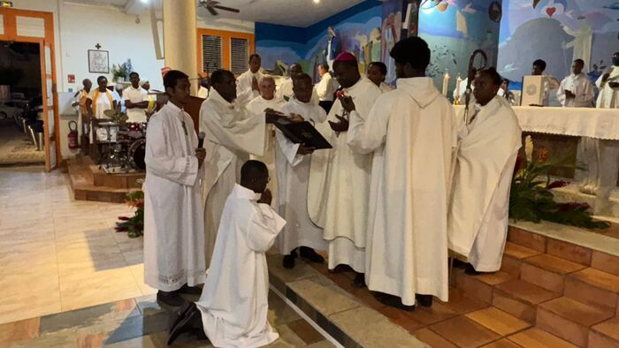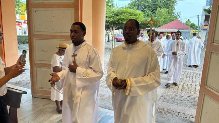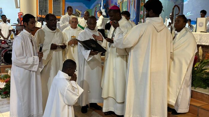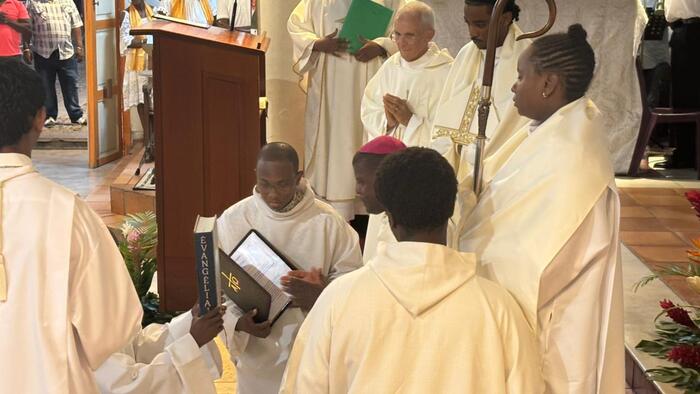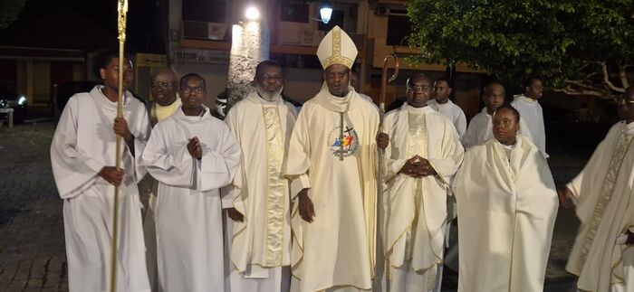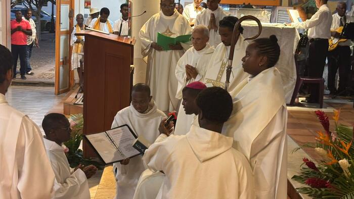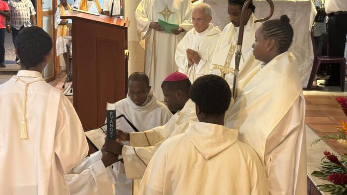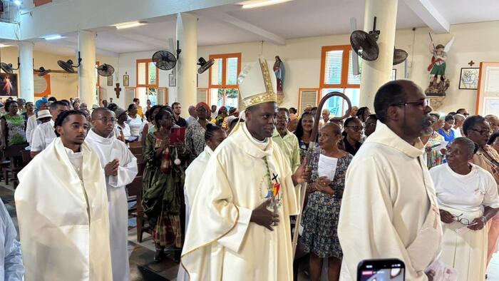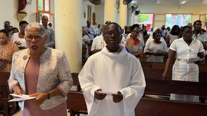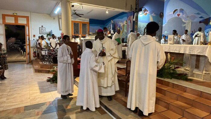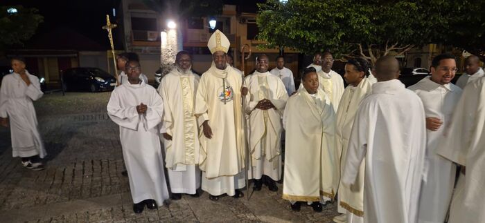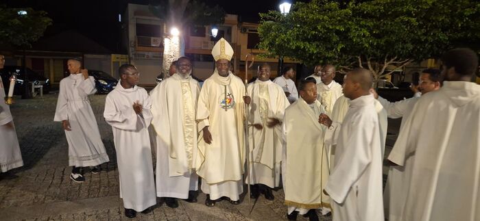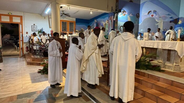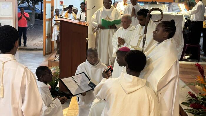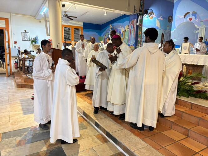 Cette célébration solennelle marquait donc l’Institution au Lectorat et à l’Acolytat du séminariste Elius DEZALLANT, en chemin vers le sacerdoce. Durant cette même messe spéciale présidée par Mgr Philippe GUIOUGOU, évêque de Guadeloupe, avec à ses côtés son vicaire général Père Gérard FOUCAN, le curé de la paroisse, Père Vincent de Paul, plusieurs autres prêtres et le diacre Paul SARLAT, nous avons rendu grâce également pour l’engagement missionnaire de Mme Gisèle ACOMAT qui s’est beaucoup investie au service diocésain de la Catéchèse et du Catéchuménat durant plusieurs années.