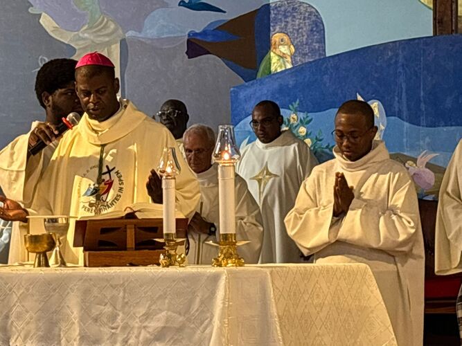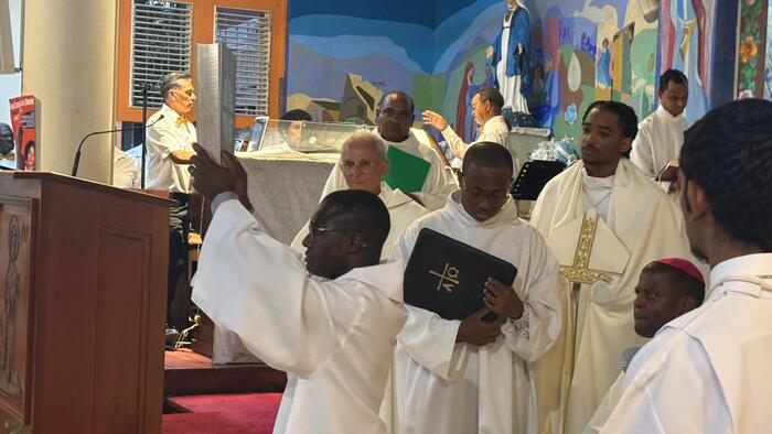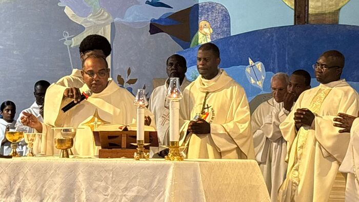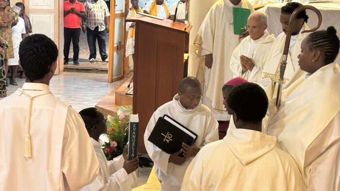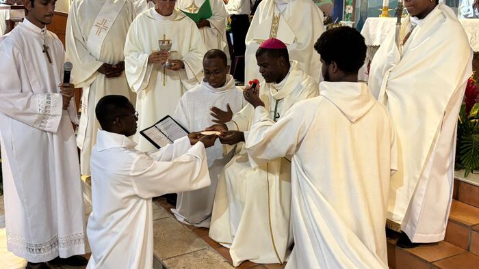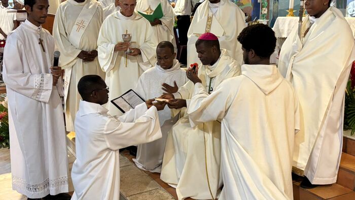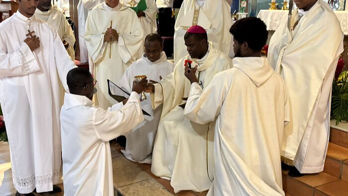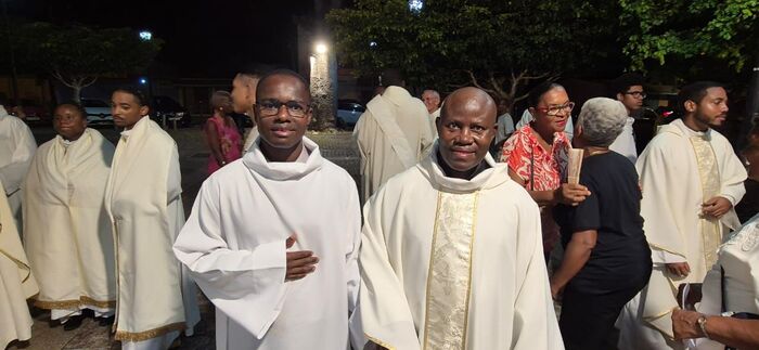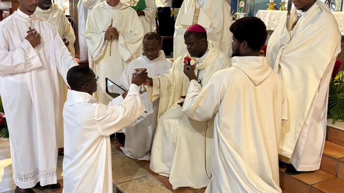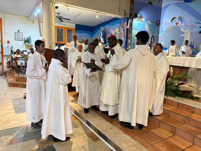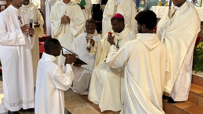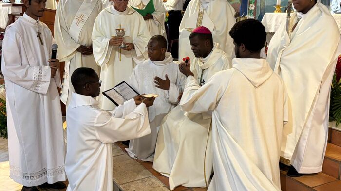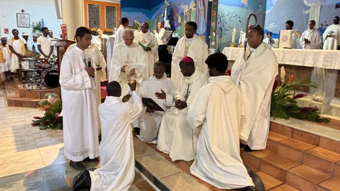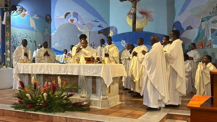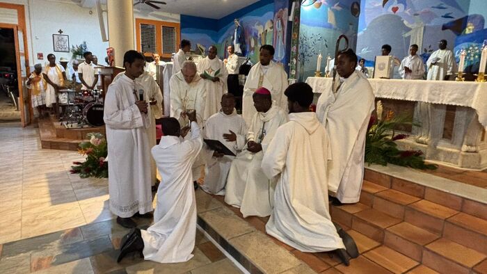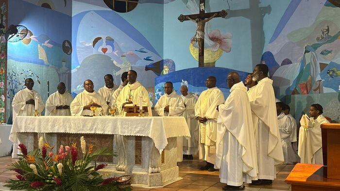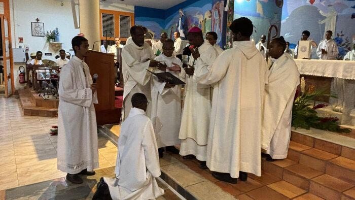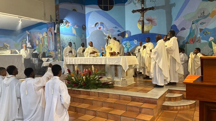 Cette célébration solennelle marquait donc l’Institution au Lectorat et à l’Acolytat du séminariste Elius DEZALLANT, en chemin vers le sacerdoce. Durant cette même messe spéciale présidée par Mgr Philippe GUIOUGOU, évêque de Guadeloupe, avec à ses côtés son vicaire général Père Gérard FOUCAN, le curé de la paroisse, Père Vincent de Paul, plusieurs autres prêtres et le diacre Paul SARLAT, nous avons rendu grâce également pour l’engagement missionnaire de Mme Gisèle ACOMAT qui s’est beaucoup investie au service diocésain de la Catéchèse et du Catéchuménat durant plusieurs années.