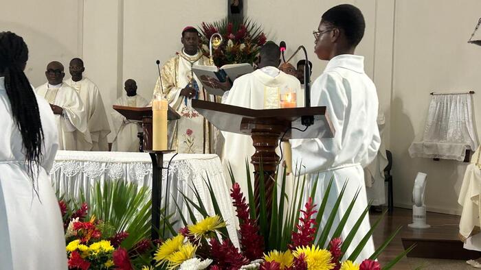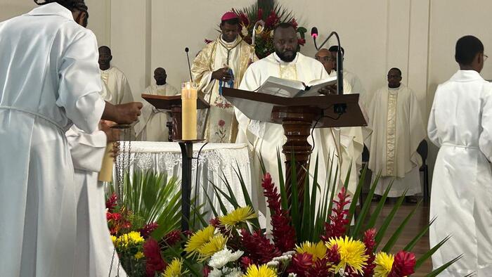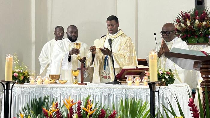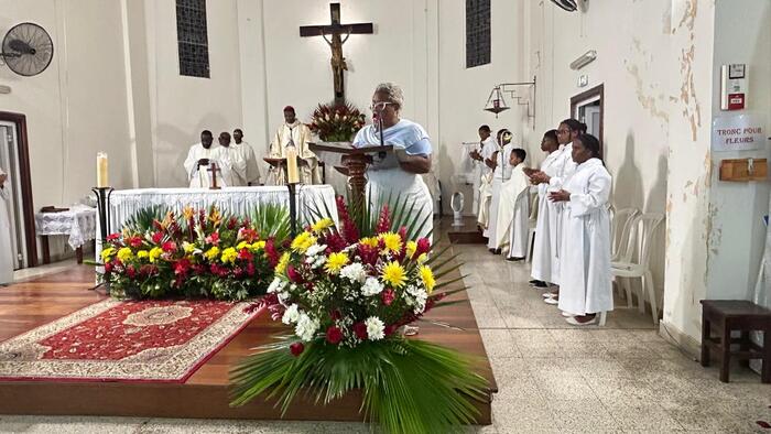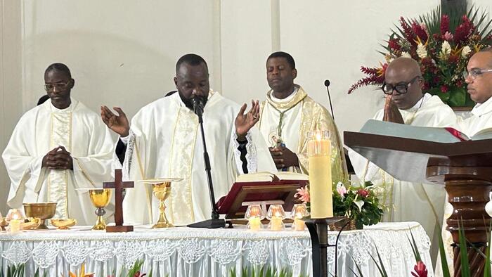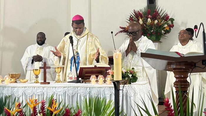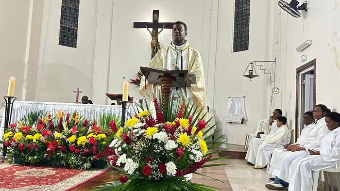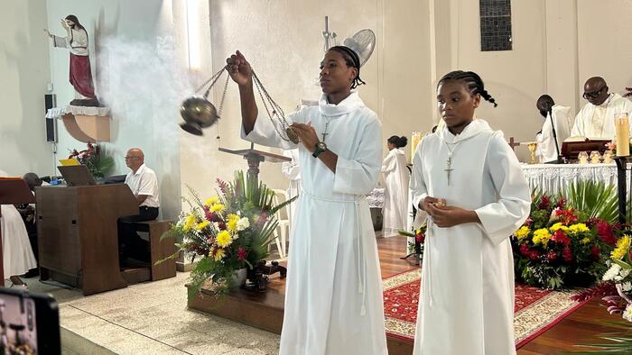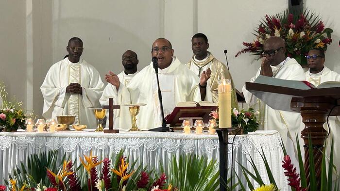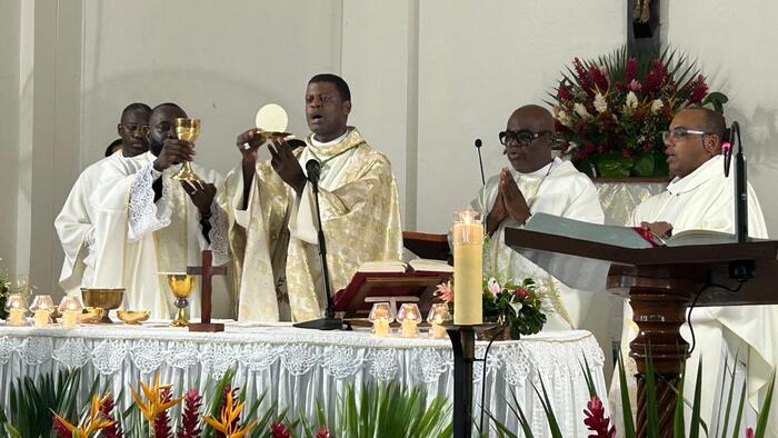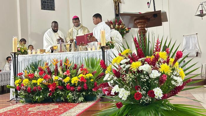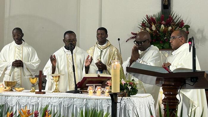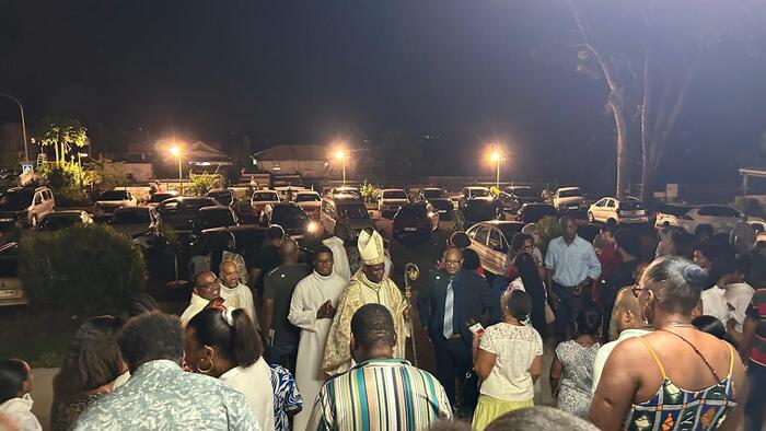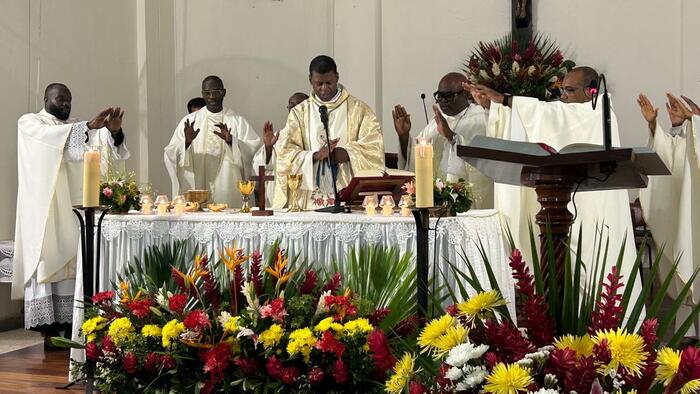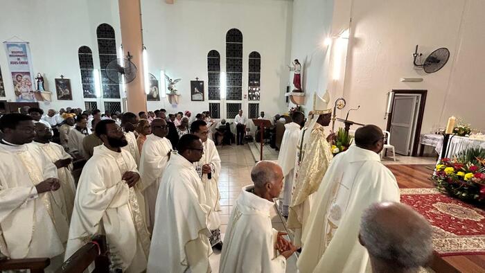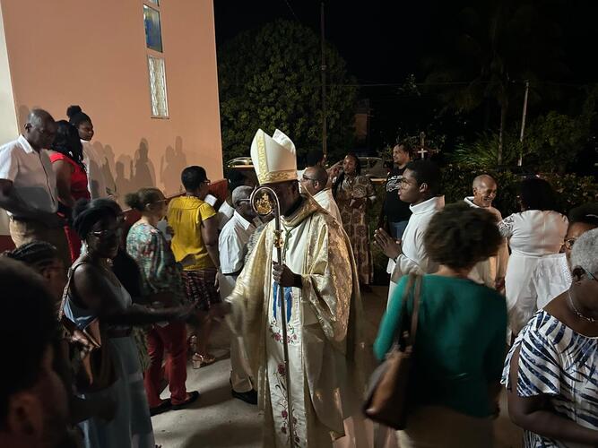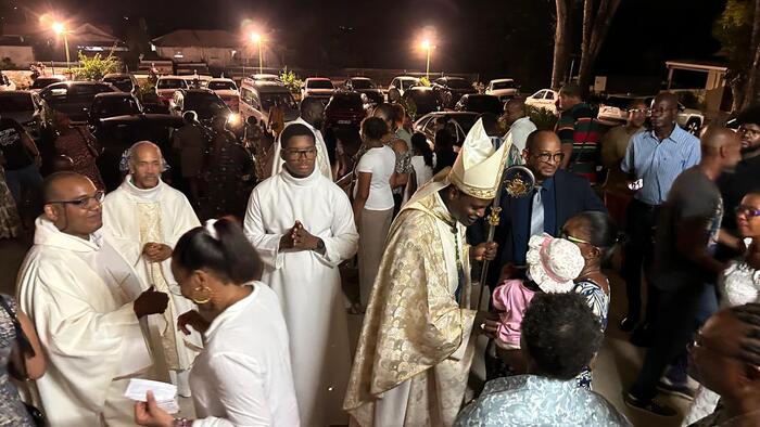L’église de Prise d’Eau, à Petit-Bourg a donc célébré avec ferveur et dans une belle dévotion, comme chaque année le 1er octobre, sa sainte patronne, Sainte Thérèse de l’Enfant Jésus. En cette année sainte, cette grande fête du calendrier liturgique a pris une dimension particulière. Mercredi soir 1er octobre 2025, c’est à 18h30 que les fidèles étaient attendus pour honorer Sainte Thérèse, d’abord avec la méditation du chapelet, avant la messe solennelle qu’a présidé Mgr Philippe, évêque de Guadeloupe, à 19h.