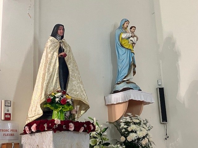 Devant une belle assemblée de fidèle et dans une église ornée de fleurs, avec de nombreuses roses au pied de la représentation de Sainte Thérèse, le pasteur de notre diocèse fit un bel enseignement sur le message profond de la spiritualité de cette vierge carmélite, docteur de l’Église, patronne des Mission.