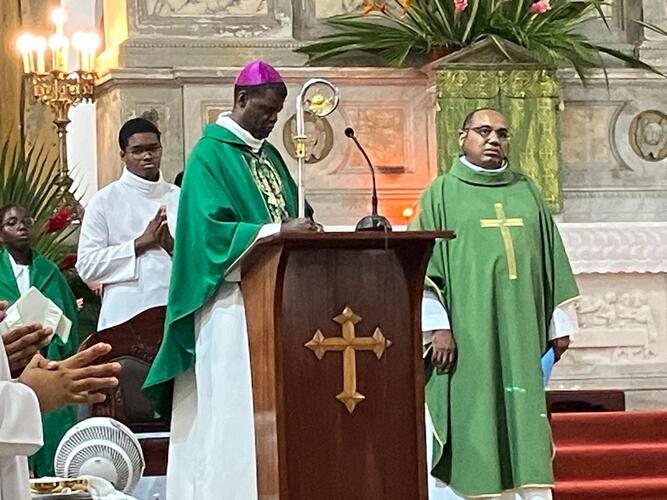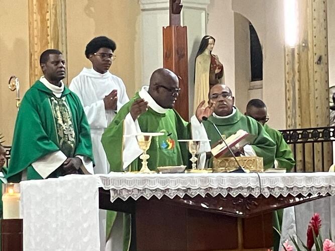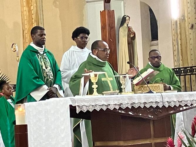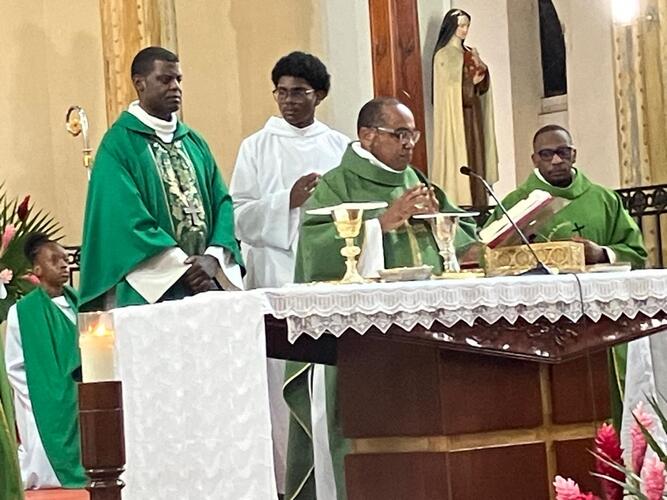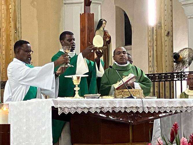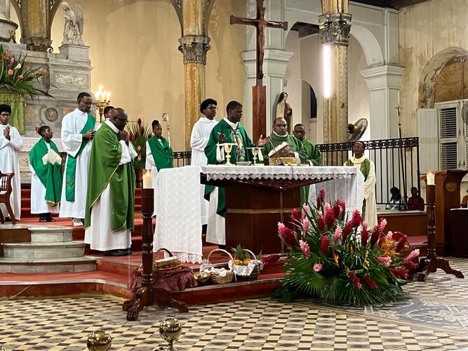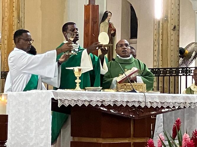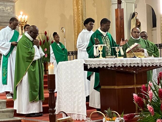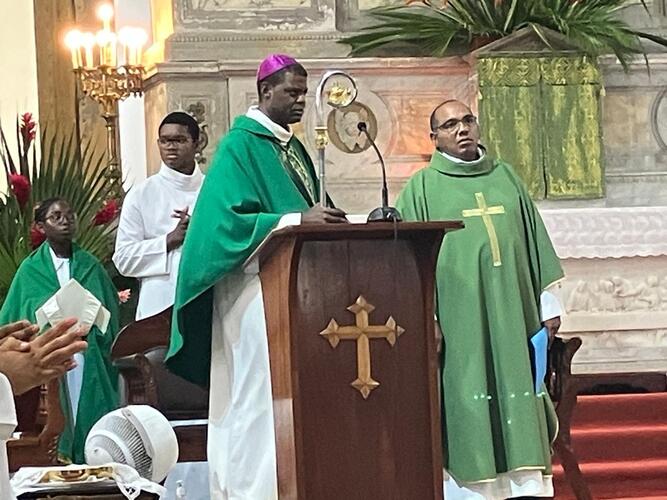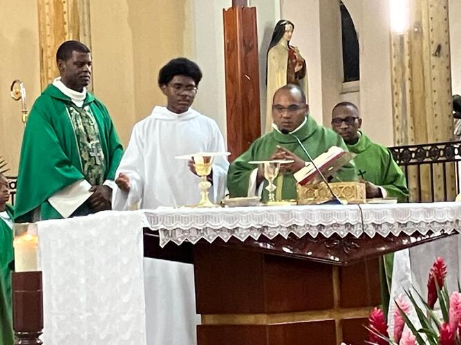A 17h30, il était temps pour tout ce beau monde d’entrer dans l’église pour vivre l’Eucharistie célébrée par l’évêque de Guadeloupe, avec à ses côtés plusieurs prêtres, au rang desquels, le Père Gérard FOUCAN, vicaire général et curé de la paroisse, son vicaire le Père Jacques, le Père Jonas SAINT-PAUL, responsable de l’aumônerie des étudiants, Père Dismas, curé du Gosier et le diacre Michel MOLIA.