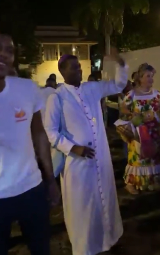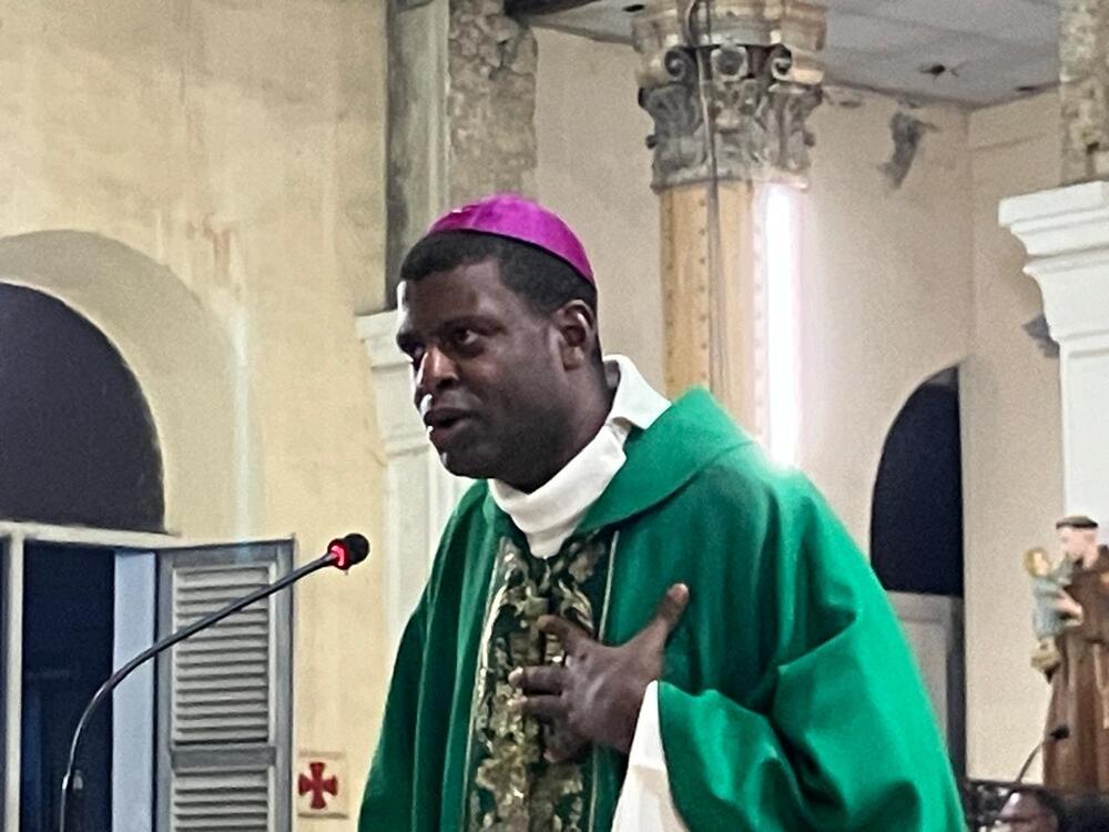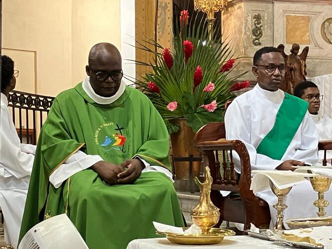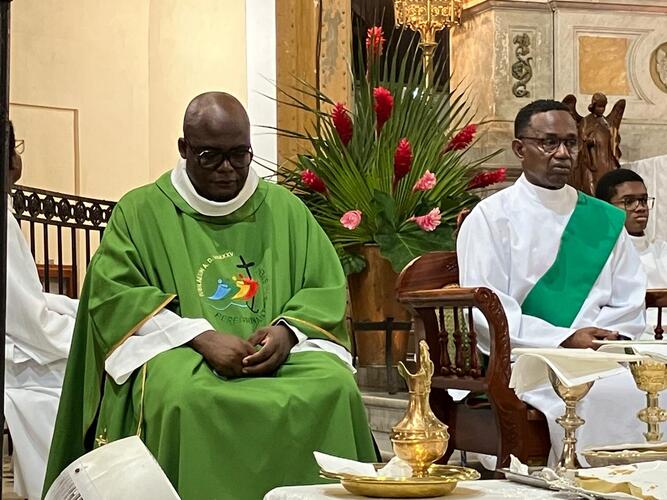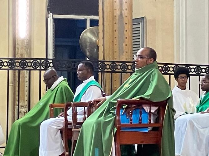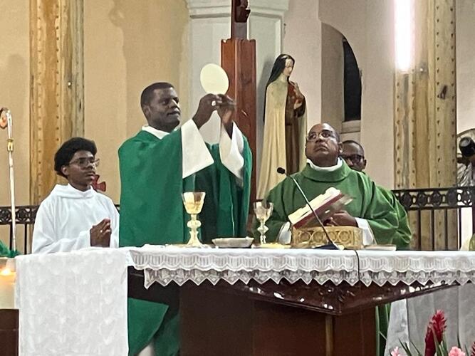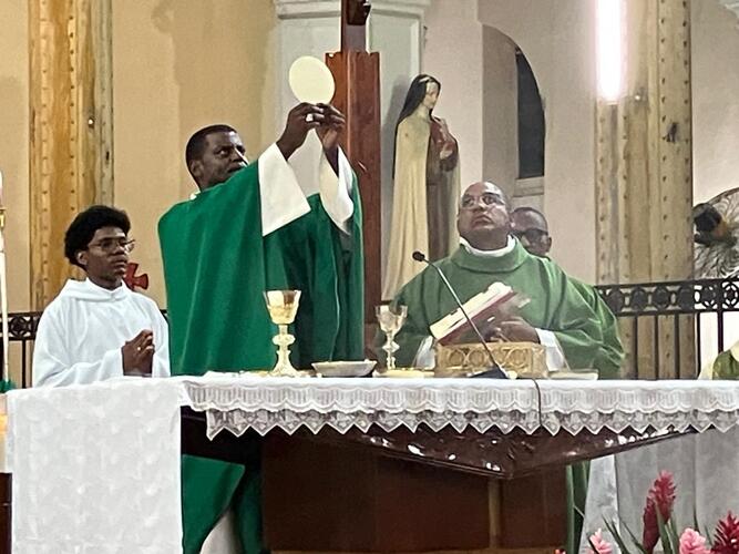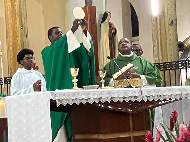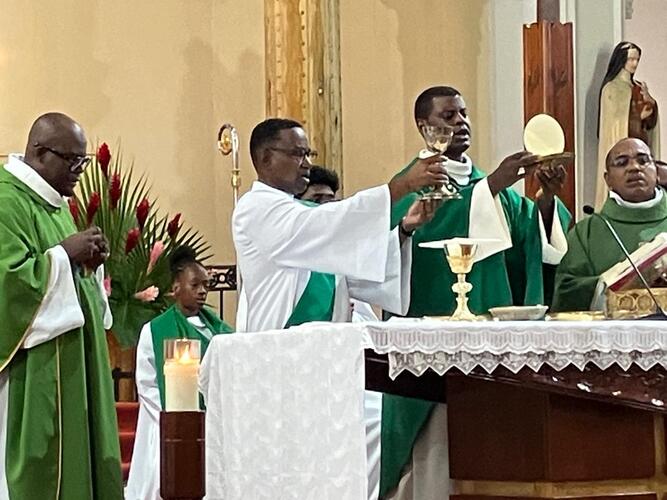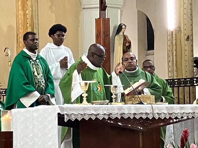 A 17h30, il était temps pour tout ce beau monde d’entrer dans l’église pour vivre l’Eucharistie célébrée par l’évêque de Guadeloupe, avec à ses côtés plusieurs prêtres, au rang desquels, le Père Gérard FOUCAN, vicaire général et curé de la paroisse, son vicaire le Père Jacques, le Père Jonas SAINT-PAUL, responsable de l’aumônerie des étudiants, Père Dismas, curé du Gosier et le diacre Michel MOLIA.