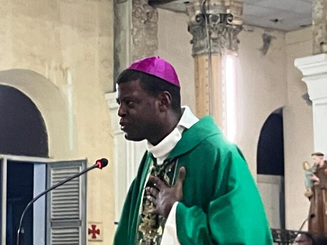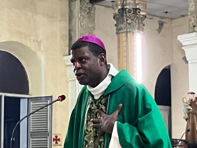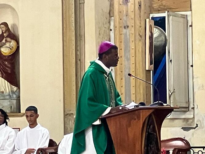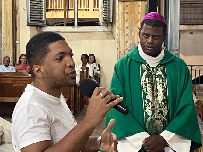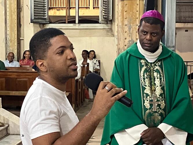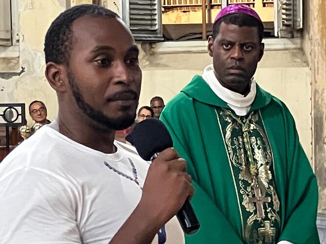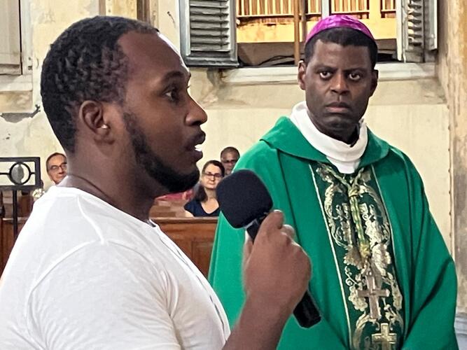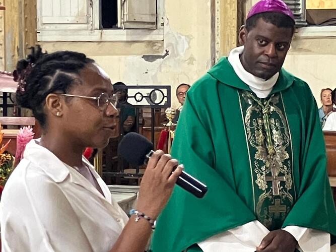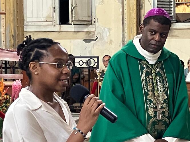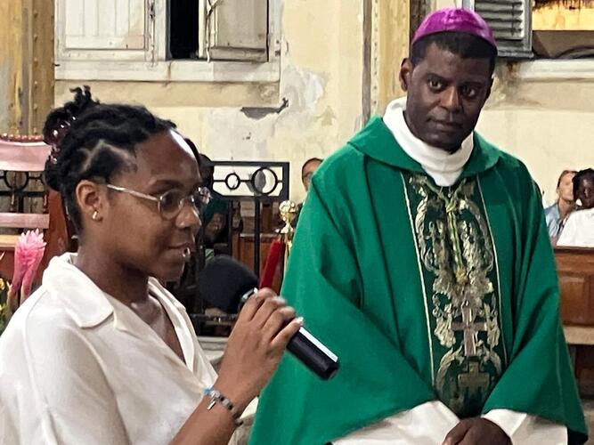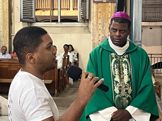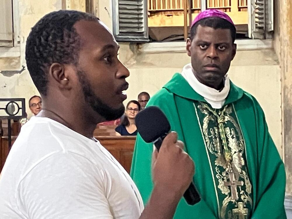 S’adressant ensuite plus particulièrement aux jeunes présents, il eut aussi ces mots. « Donne le meilleur de toi-même. C’est là que le Seigneur t’attend. C’est là que notre société, notre Eglise, vous attend, en donnant le meilleur de vous-même. Donnez à Dieu toujours la première place. Chers jeunes, dans cette vie d’Eglise, avec le Christ, cette invitation à ce que vous participiez chacun dans la société et la vie de notre Eglise, et surtout n’hésitez pas à témoigner auprès de vos amis, de vos camarades, de ce que l’Eglise fait dans votre vie, de ce que le Christ fait dans votre vie » a dit encore Mgr Philippe GUIOUGOU dans son homélie. Homélie interactive et participative durant laquelle, l’évêque de Guadeloupe a fait témoigner plusieurs jeunes sur ce que Dieu fait dans leur vie.