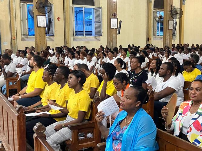 Ils étaient très nombreux, remplissant la quasi-totalité des bancs de l’église Saint-Pierre et Saint-Paul, à Pointe-à-Pitre, samedi 11 octobre 2025, à 17h30. La messe de rentrée des étudiants présidée par Mgr Philippe GUIOUGOU a tenu toutes ses promesses. L’évènement a été, il faut le dire, parfaitement organisé par les aumôneries étudiantes de Grande-Terre et de la Basse-Terre, autour du père Jonas SAINT-PAUL, en charge de cette mission. Mais c’est aussi et surtout grâce à l’implication des jeunes, qui se sont totalement investis dans l’organisation que les étudiants ont répondu présents. Ils étaient d’ailleurs là, pour la plupart, dès le milieu de l’après-midi, devant l’église où un forum avec des stands d’information et des animations, les attendaient.