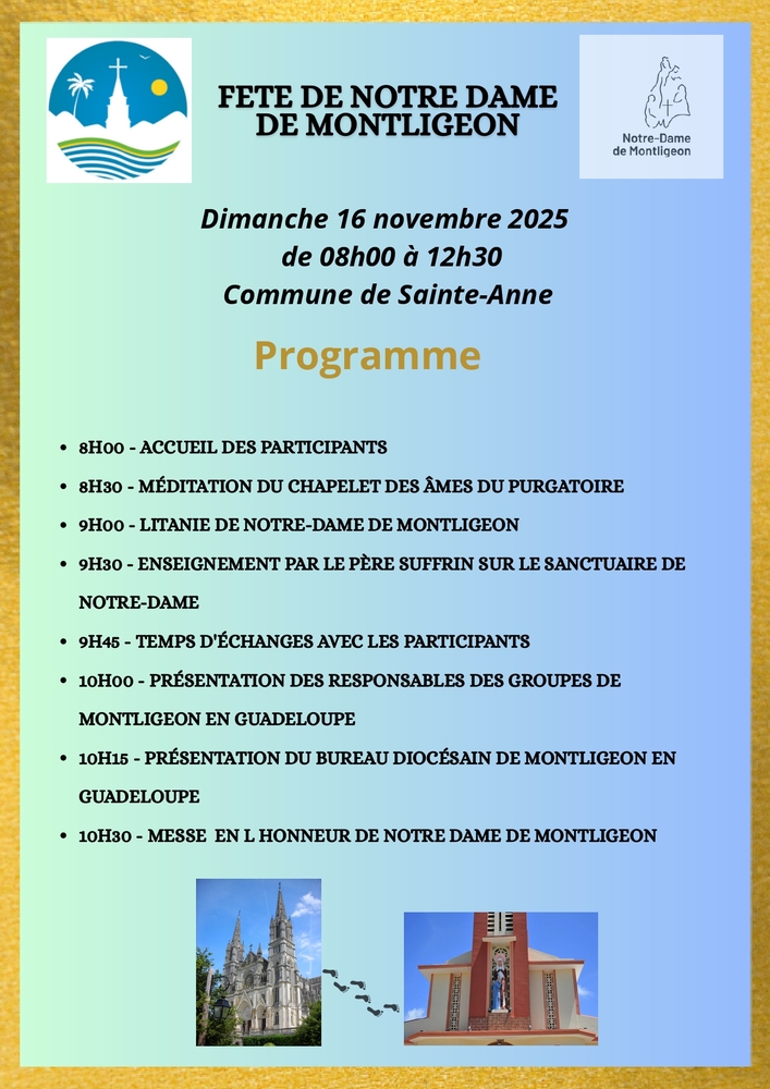 Pour la première fois en Guadeloupe, le diocèse se rassemble pour célébrer solennellement la fête de Notre-Dame de Montligeon, patronne des âmes du Purgatoire. Cette messe, présidée en l’église de Sainte-Anne le dimanche 16 novembre à 10h30, marque une étape spirituelle majeure pour la communauté chrétienne de l’archipel. Elle est organisée par le Bureau diocésain de Notre-Dame de Montligeon et les huit groupes de prière de Guadeloupe, en collaboration avec le Sanctuaire de Montligeon (France).