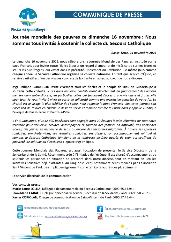 Vendredi14/11Journées Diocésaine de la Jeunesse (JDJ) : Dimanche 23 novembre 2025, au Complexe sportif Michel Benjamin à Pointe-à-Pitre.