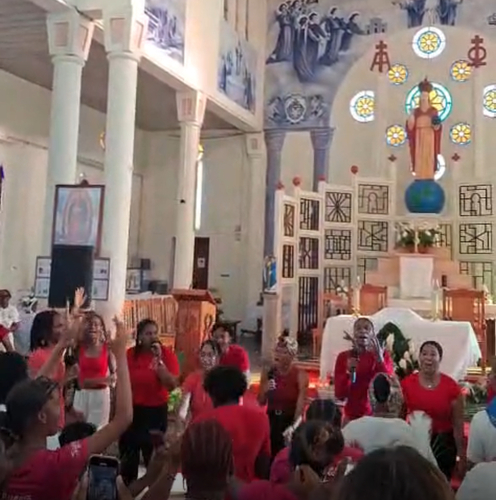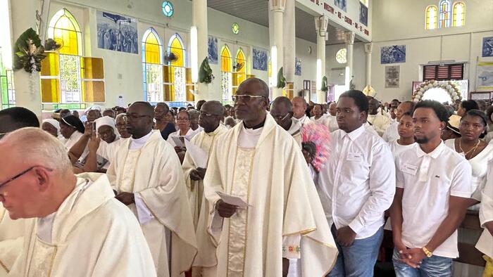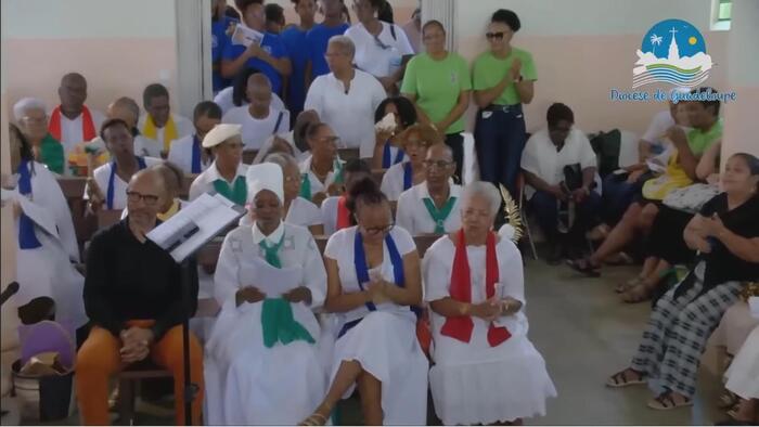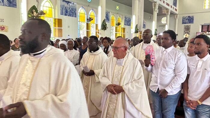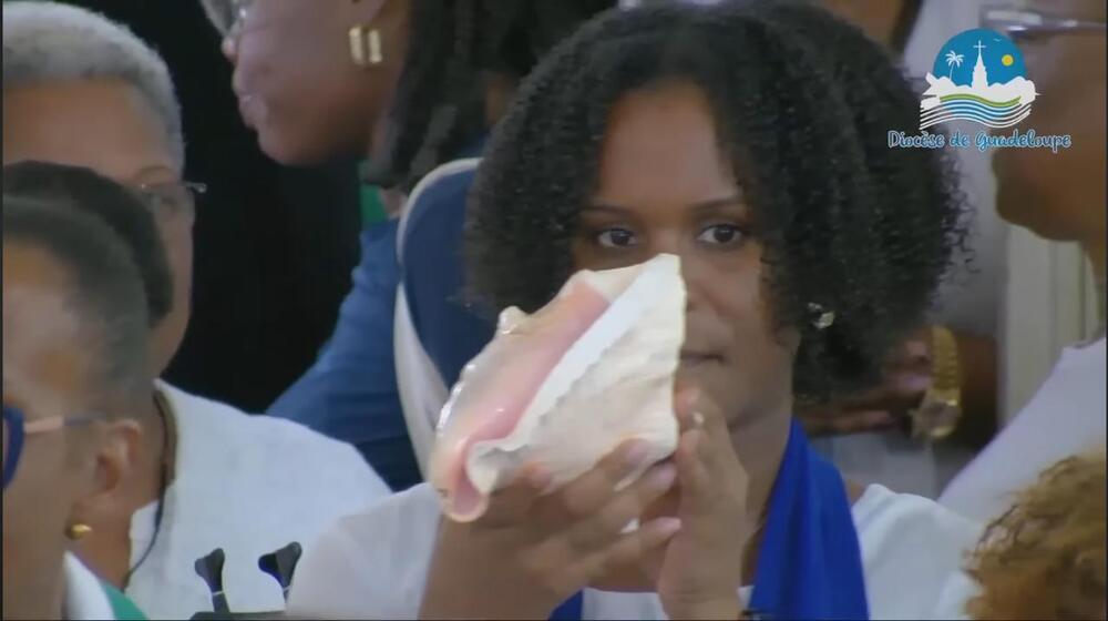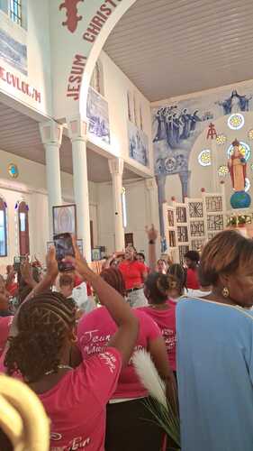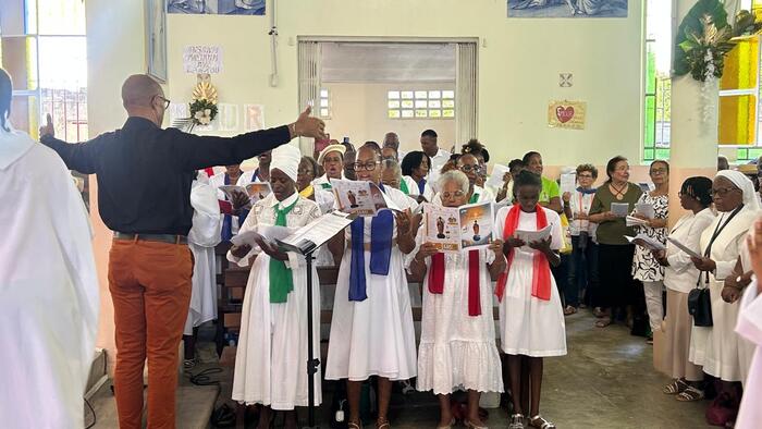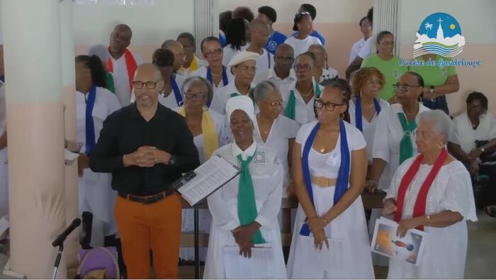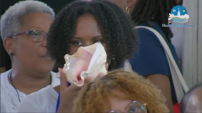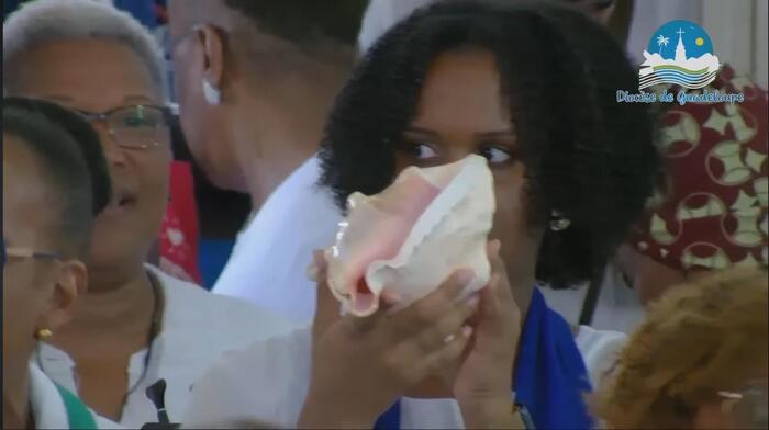 Cette messe jubilaire fut brillamment animée par la chorale formée en Doyenné pour l’occasion avec choristes venus de plusieurs paroisses du secteur. Le son du ka associé à celui du souffle de la conque de lambi magistralement joué par une jeune de cette chorale. Ces notes mêlées aux voix de la chorale contribuèrent à la beauté de la liturgie de cette célébration et à l’élévation des âmes. « Ce son de la conque de lambi m’a littéralement pris aux tripes » nous a d’ailleurs confié une fidèle. Il y eut enfin cet autre souffle, celui de l’Esprit, qui conduisit l’assemblée a prolonger spontanément, le chant d’action de grâce « Ave Maria » au terme de cette très belle célébration, alors que la chorale avait terminé son interprétation.