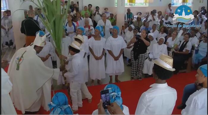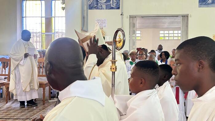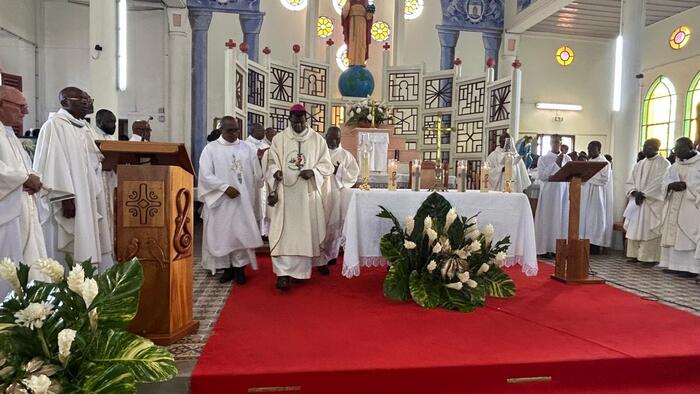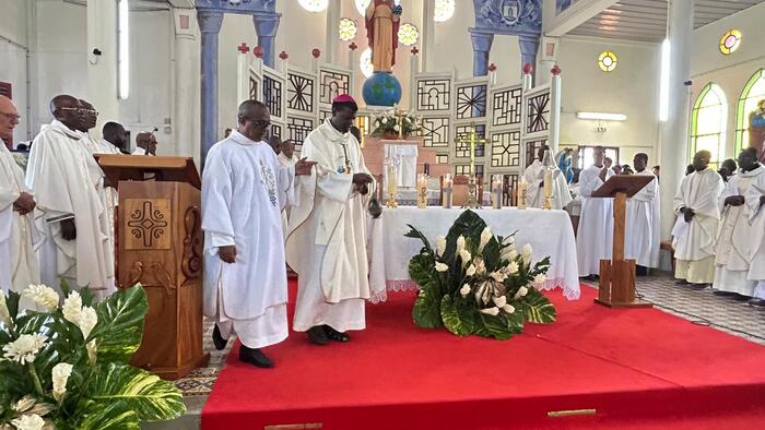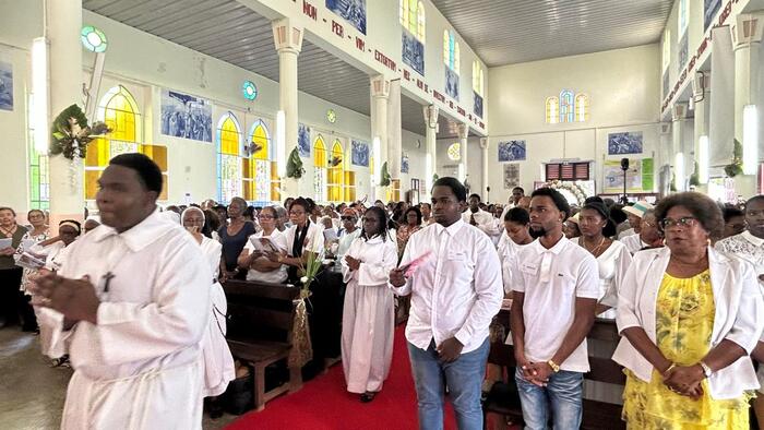 Après l’enseignement dispensé par le Père Frédéric ESSENGO, curé des paroisses de Petit-Canal, sur le thème de l’espérance, avec une explication du sens profond de l’indulgence jubilaire, vint le moment de la reposition du Saint-Sacrement, avant la messe présidée à 10h, par Mgr Philippe GUIOUGOU. L’affluence était alors à son maximum pour la célébration de cette Eucharistie qui était retransmise en direct sur Radio Massabielle et les réseaux sociaux du diocèse (cliquez sur ce lien pour revivre en image cette Eucharistie).
