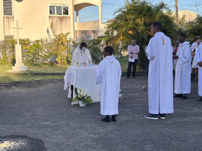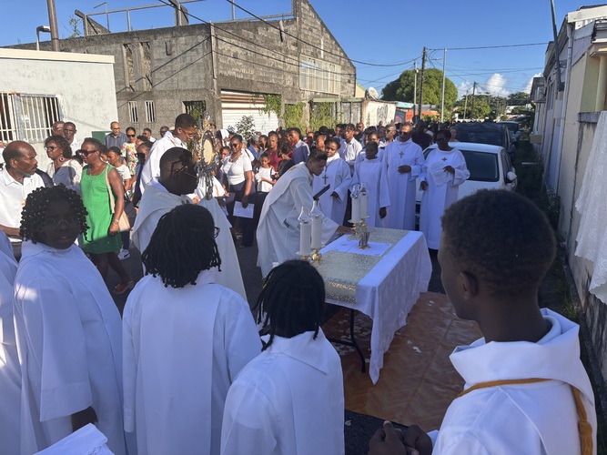 À la fin des 4 reposoirs, la Procession du Très Saint Sacrement prend la direction de l’Eglise du RAIZET , pour la célébration eucharistique, avec les voix raisonnantes des chorales « Alléluia, salut puissance et gloire au seigneur ! » Et « Fais paraître ton jour et le temps de ta grâce .. »