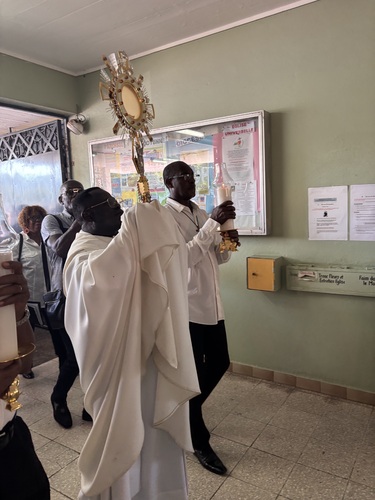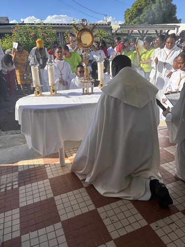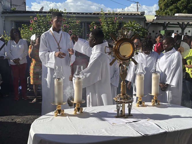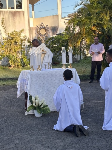 Le prêtre commence en nous rappelant le sens de la Procession du Très Saint Sacrement qui marque également la fête du Christ Roi de l’Univers : il y a 3 raisons essentielles