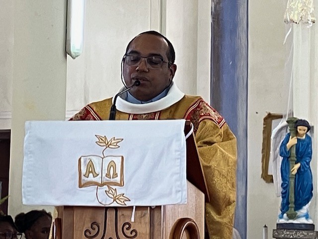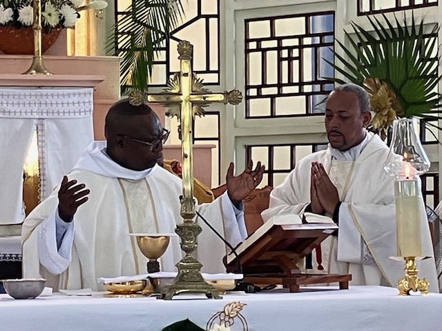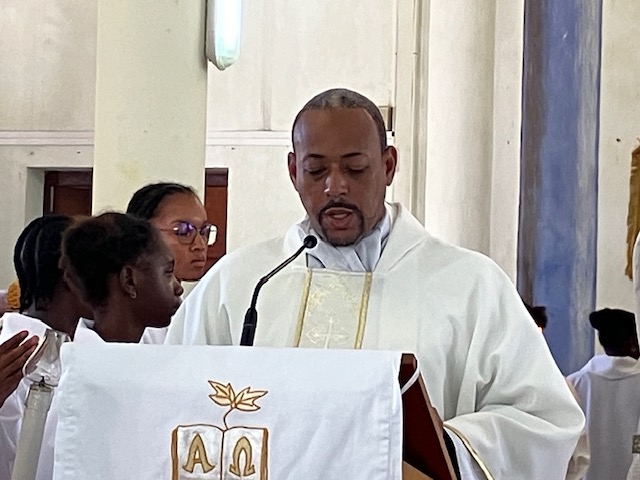 Une première messe y avait été célébrée à 7h par Père Frédéric ESSENGO, tandis que Père Cédric BLONDIN, en faisait de même à l’église Saint-Philippe et Saint-Jacques du bourg. La célébration solennelle, prévue à 10h, était présidée par Père Gérard FOUCAN, vicaire général de notre diocèse, avec à ses côtés bien entendu le curé des paroisses de cette localité du nord Grande-Terre, Père Frédéric et son vicaire Père Cédric, en présence des autorités civiles, en l’occurrence le maire de la commune, M. Blaise MORNAL.