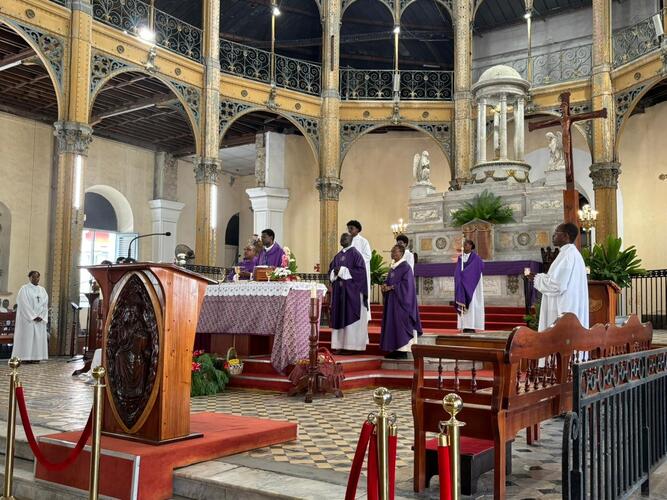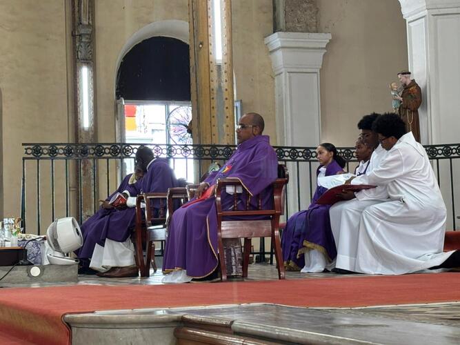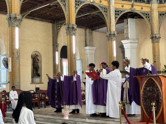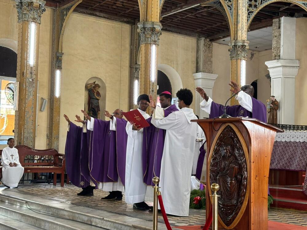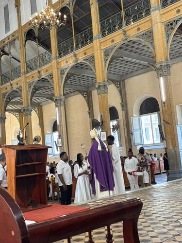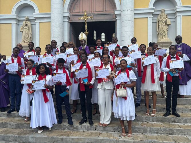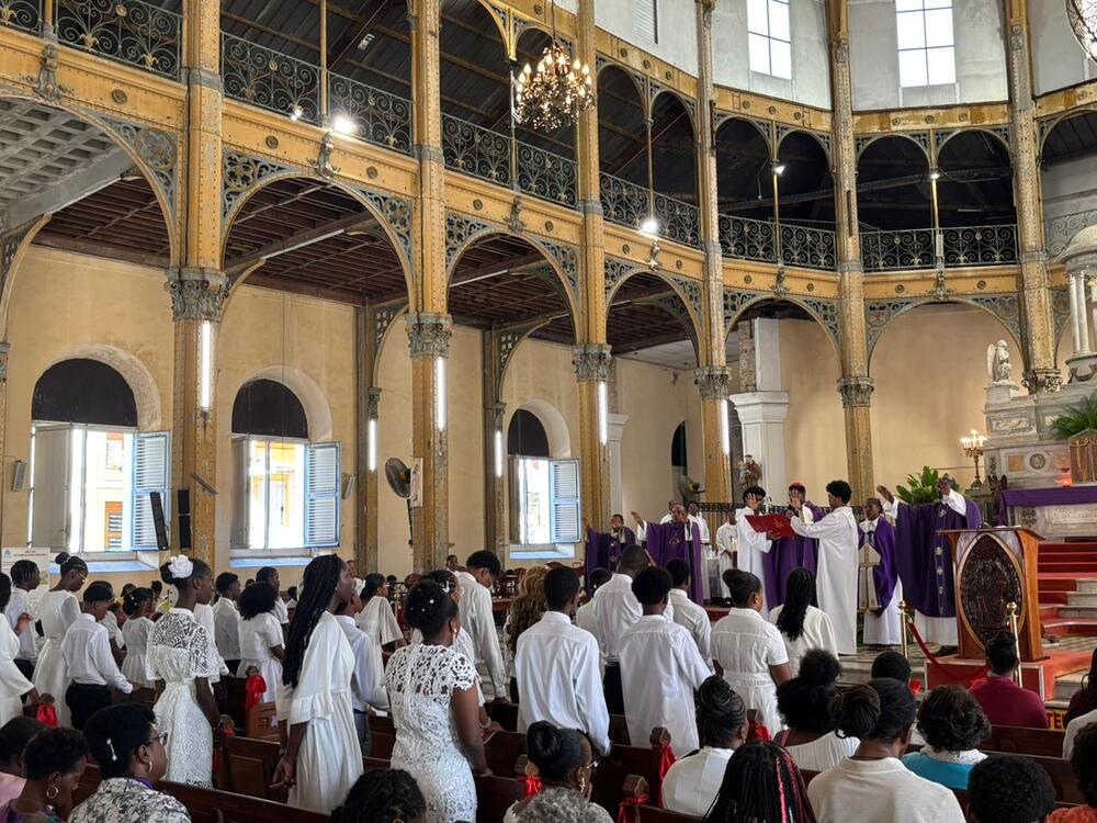 29 jeunes ont reçu le sacrement de la Confirmation ce dimanche 30 novembre 2025, à l’église Saint-Pierre et Saint-Paul de Pointe-à-Pitre. Un sacrement que leur a conféré, par l’imposition des mains et l’onction, Mgr Philippe GUIOUGOU, évêque de Guadeloupe, assisté de son vicaire général, Père Gérard FOUCAN, curé de cette paroisse. Le père Jacques, vicaire de Saint-Pierre et Saint-Paul et le Père Sosthène GODJO, de la Martinique ont également concélébré cette Eucharistie particulière à plus d’un titre pour tous ces jeunes, qui entrent dans ce temps de l’Avent avec joie. Avant leur appel nominatif, deux de ces jeunes ont fait un témoignage prouvant vraiment que « l'espérance ne déçoit pas ».