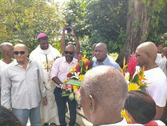 Après cette Eucharistie, à laquelle ils ont participé, les chefs d’édilités des quatre communes du Nord Grande-Terre, Jean-Marie HUBERT, maire de Port-Louis, Edouard DELTA, maire d’Anse-Bertrand, Blaise MORNAL, maire de Petit-Canal, et Jean BARDAIL, le maire de Morne-À-L’eau, ont procédé ensemble au dépôt de gerbes sur la stèle mémorielle des ouvriers décédés, qui ont succombé ici à Beauport, sur leur lieu de travail.