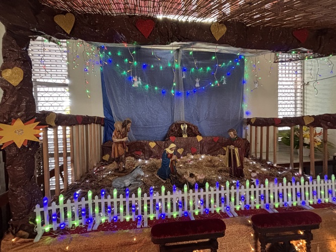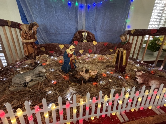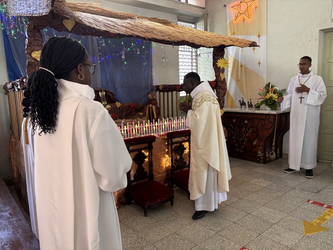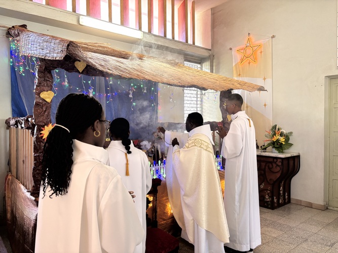 Père CAPO commence par « Joyeux Noël !!! » à 3 reprises avec l’assemblée en écho qui était présente à la Messe de la Nativité du Seigneur , il se dirige ensuite vers la crèche.