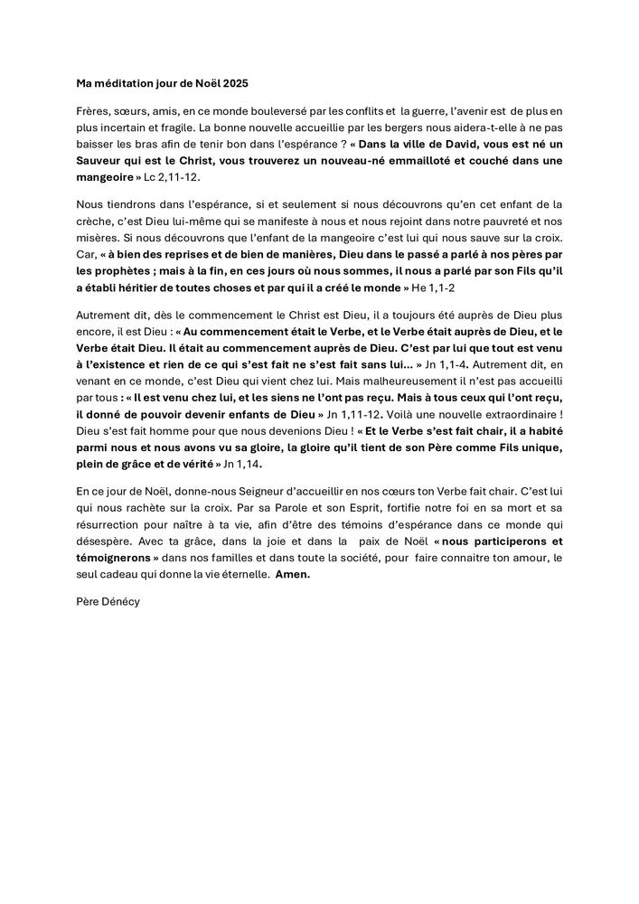 La méditation de la Parole de Dieu du dimanche 21 décembre 2025, 4ème dimanche de l’Avent par le Père André DENECY, curé de la paroisse de Lamentin.