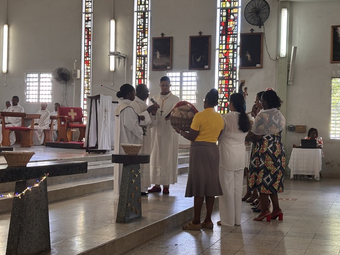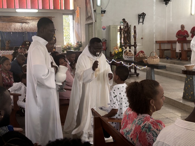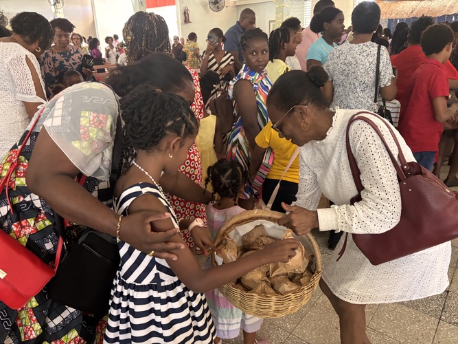Après l’eucharistie les enfants ont été mis à l’honneur par la bénédiction des paniers de petits pains distribués par les catéchistes, ainsi que la bénédiction de leurs jouets.