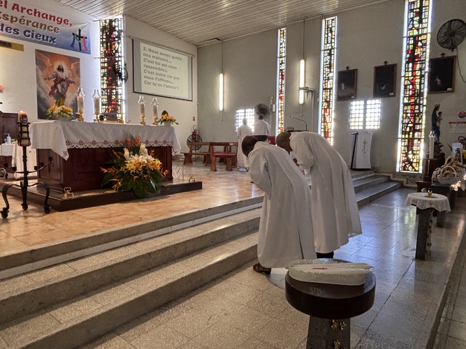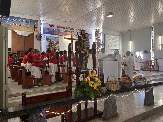 L’homélie du prêtre débute ainsi : Sœurs et frères en contemplant la figure de Saint Joseph nous allons tout simplement prier pour le monde entier .