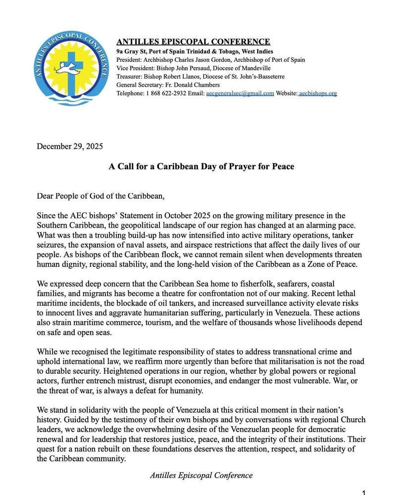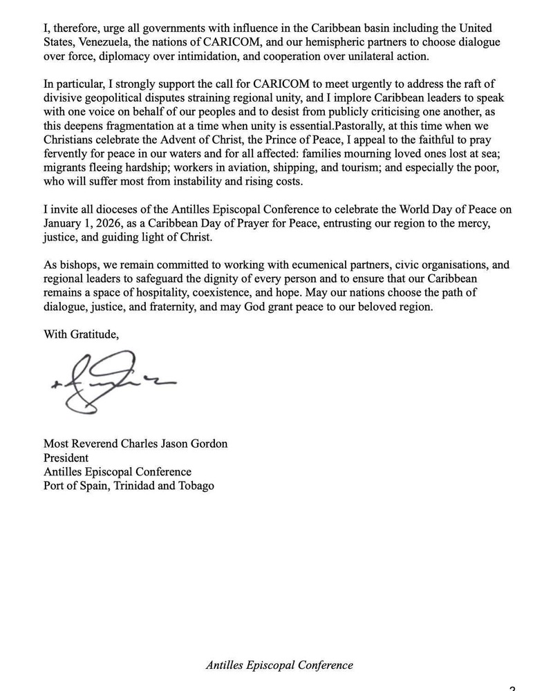 Dans son message, le président de la Conférence Episcopale des Antilles et archevêque de Port-of-Spain, Mgr Jason Gordon, a déclaré qu'il exhortait tous les gouvernements « ayant une influence dans le bassin caribéen, y compris les États-Unis, le Venezuela ainsi que les 15 membres de la Communauté caribéenne (CARICOM) et nos partenaires de l'hémisphère à choisir le dialogue plutôt que la force, la diplomatie plutôt que l'intimidation et la coopération plutôt que l'action unilatérale ».