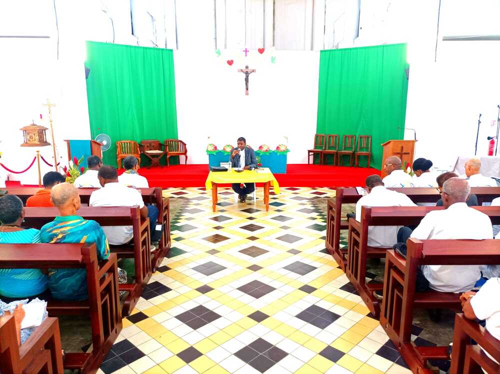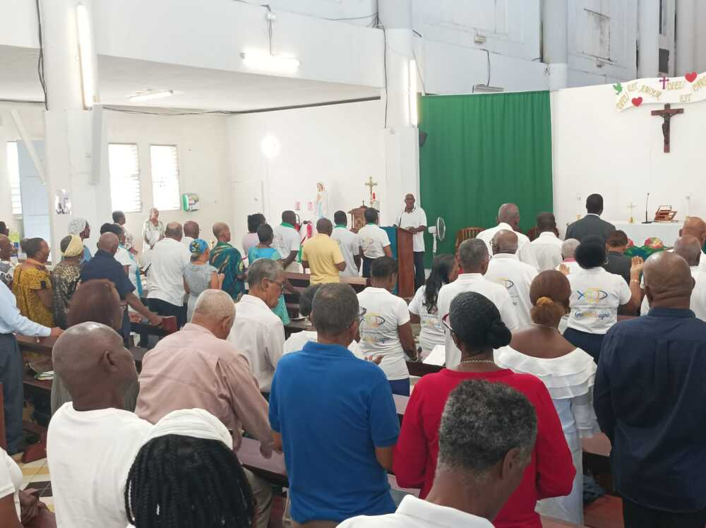 Cet exercice terminé, un moment de recueillement était dès lors proposé pour se préparer à la célébration eucharistique qu’a présidé à 10h, Mgr Philippe GUIOUGOU, avec à ses côtés le Père Godefroid, le curé de la paroisse. Une messe durant laquelle, le pasteur de notre diocèse a beaucoup insisté dans son homélie sur les grands défis que doivent relever nos familles guadeloupéennes pour incarner ce rempart de nature à prévenir les maux et dérives de notre société en rupture de repères. Après cette célébration dominicale à laquelle ont pris part également les fidèles de la paroisse, car c’était la 2ème messe, Mgr Philippe a enchainé avec son enseignement sur le thème du couple missionnaire. L’amour conjugal c’est l’annonce de l’Evangile par les actes a notamment prêché l’évêque de Guadeloupe. Le premier lieu de la mission du couple au sens de l’Eglise, c’est le foyer, a souligné Mgr Philippe GUIOUGOU, non sans avoir insisté sur la dimension vocationnelle intimement liée au mariage chrétien.