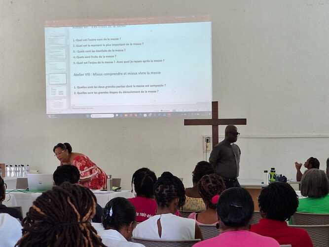 La matinée s’est articulée autour de trois temps forts : une introduction sur la messe (origine, sens et déroulement), des travaux en ateliers, puis une synthèse et un enseignement. Les travaux en ateliers, menés en petits groupes, ont permis aux catéchistes de réfléchir et d’échanger autour de questions essentielles, parmi lesquelles : Pourquoi la messe est-elle la source et le sommet de la vie chrétienne ? En quoi la messe est-elle une invitation, un rendez-vous et une rencontre avec le Seigneur ? Pourquoi est-il important d’aller à la messe et qu’y venons-nous chercher ? Comment la messe nourrit-elle notre relation personnelle avec Dieu et notre vie communautaire ? Choisir d’aller à la messe est-il un acte de liberté, de fidélité et d’amour ? Quel est l’enjeu spirituel de la messe pour notre salut ?