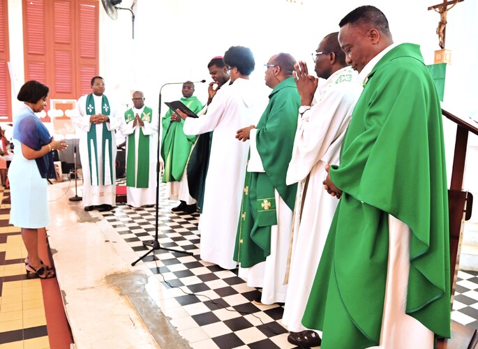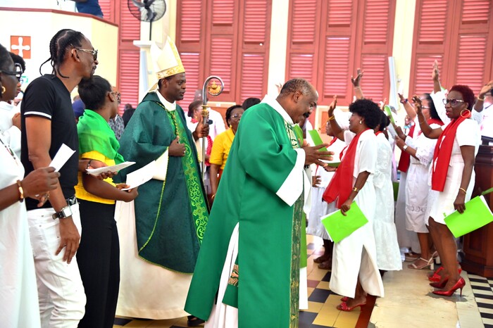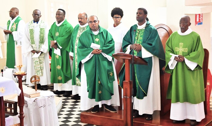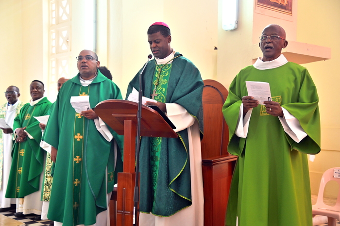 Plusieurs prêtres ont concélébré cette messe solennelle aux côtés de Mgr Philippe. Au rang de ceux-ci, le Père Gérard FOUCAN, vicaire général, le Père Patrix DESEIDE, curé de Sainte-Rose et aumônier du Renouveau Charismatique Diocésain, le Père Anthony ETIENNE, qui fut aussi aumônier du Renouveau, le Père Innocent, vicaire de la paroisse de Baie-Mahault et le Père Julien DOSSOU, curé d’Anse-Bertrand. Les diacres Frantz DESSOUT et José OBERTAN étaient là également. Le curé de Baie-Mahault, Père Roland KINKOUNI, en déplacement hors du diocèse, s’est uni à ce temps fort, par la prière.