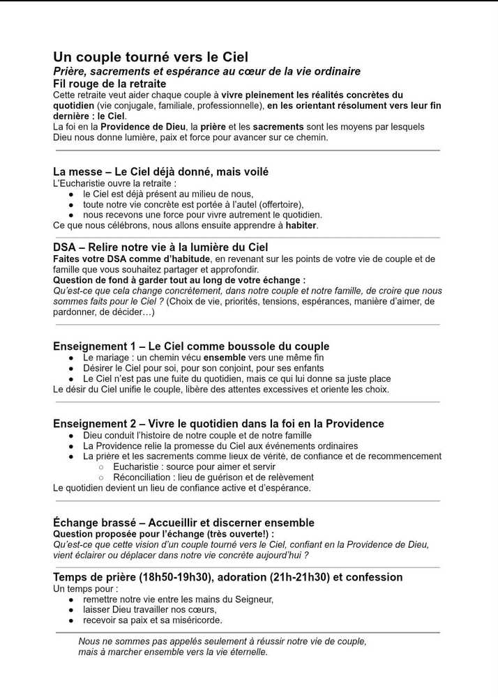 Sandrine et Manuel MONTRESOR des Equipes Notre-Dame de Guadeloupe, ont été appelés à animer cette retraite avec comme prédicateur le Père Rodrigo, curé de la paroisse Saint-Louis des Français, de Madrid. Ils partagent avec nous le programme détaillé de cette retraite. Voir le document ci-dessous.
