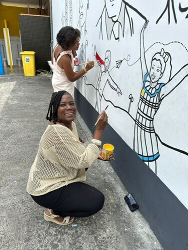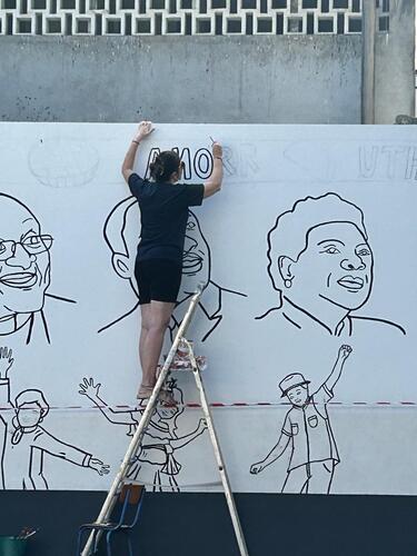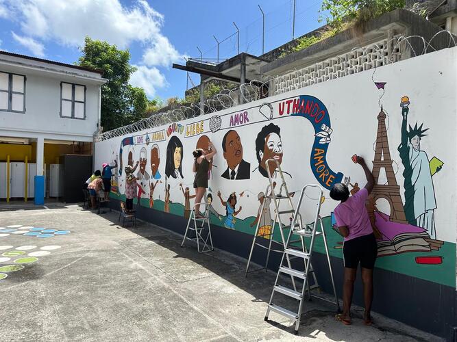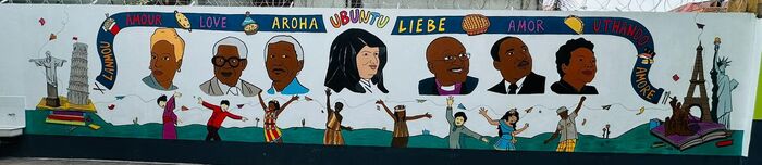 La fresque met en lumière des figures dont les parcours incarnent cet esprit d’engagement pour la justice et la dignité humaine : de gauche à droite, Gerty Archimède, Aimé Césaire, Nelson Mandela ; au centre, Anne-Marie Javouhey, fondatrice de la congrégation des Sœurs de Saint-Joseph de Cluny ; puis Desmond Tutu, Martin Luther King et Maya Angelou. Leur présence offre des repères inspirants pour réfléchir aux valeurs d’Ubuntu et à leur traduction dans la vie personnelle et collective.