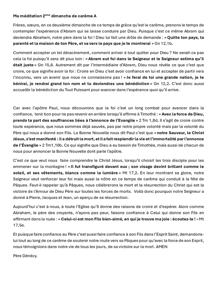 La méditation de la Parole de Dieu du dimanche 22 février 2026, 1er dimanche de Carême, par le Père André DENECY, curé de la paroisse de Lamentin. [...]