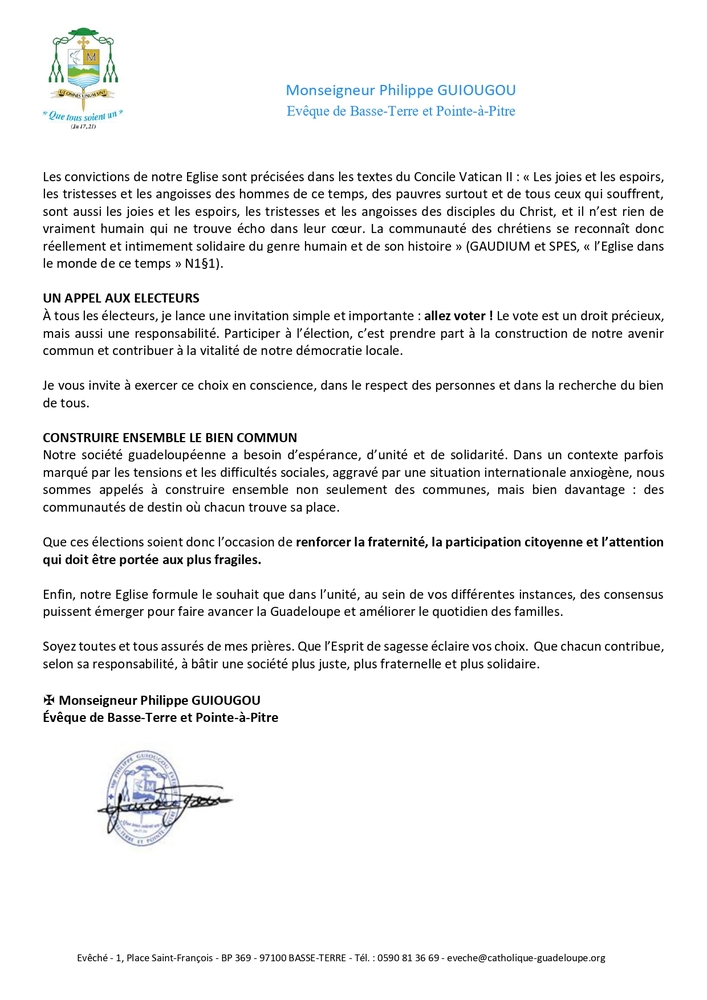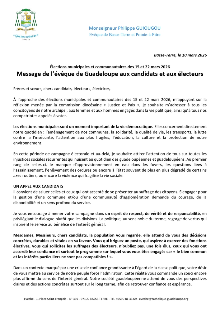 Dans une lettre publiée dans le mensuel l'Eglise en Guadeloupe du mois de mars, sur les réseaux sociaux du diocèse qui sera largement diffusée, Mgr [...]
