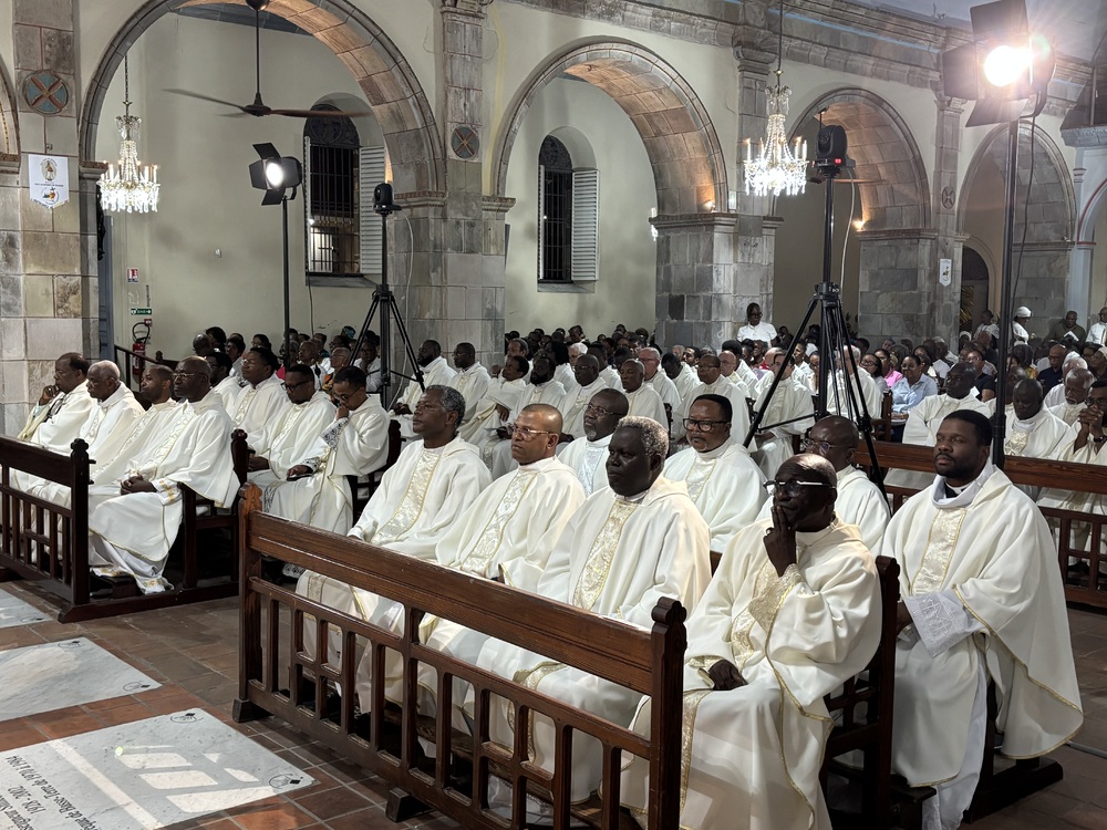 Je vais prêcher particulièrement, ça ce n'est pas étonnant, sur le oui du prêtre, ce oui que vous prononcerez aujourd'hui, en ce lundi saint, en cette messe chrismale. Chers frères et sœurs, prêtres, diacres consacrés, en cette messe chrismale, vous êtes rassemblés autour de moi-même, votre évêque, pour célébrer l'unité de l'Église et du sacerdoce. Nous venons de différentes paroisses de notre diocèse archipélique. Les plus loin, venant de Saint-Martin et Saint-Barthélémy. En cette messe, nous bénirons les saintes huiles, signes de la grâce de Dieu à l'œuvre dans nos vies. Ces huiles qui servent pour différentes circonstances que nous, prêtres administrons ; laïcs, que vous recevez.
