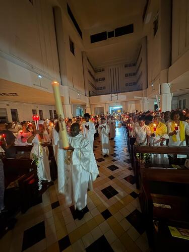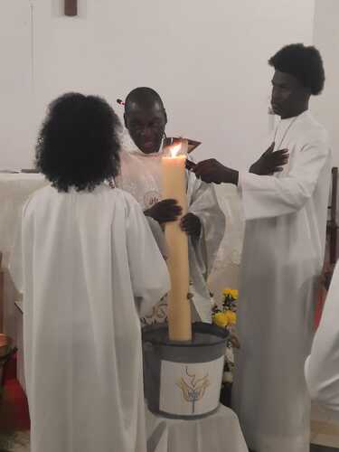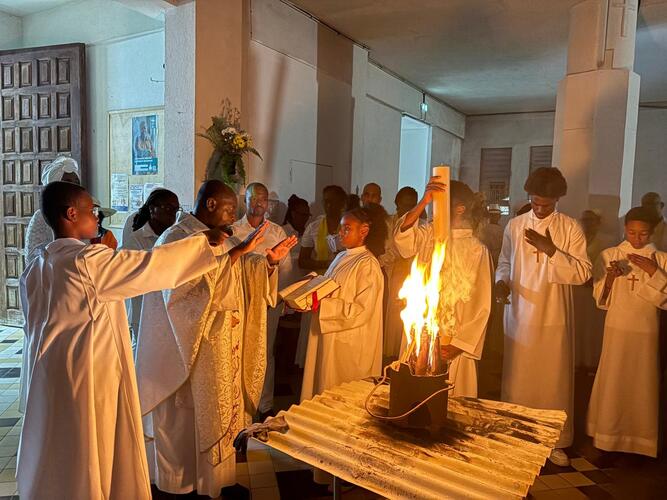 A 19h précises, les fidèles de la paroisse St André et les nombreux visiteurs ont comme toujours entamé la célébration du samedi saint par la liturgie du feu et de la lumière au fond de l'église dans la pénombre. Seul brûle le feu qui est béni, suivi du cierge pascal portant les mentions 'alpha' et 'oméga' symbolisant le Christ au commencement de tout et jusqu'à la fin du monde. La lumière du cierge pascal, symbole du Christ victorieux sur la mort, est ensuite partagée à tous les fidèles, qui à la suite du Sauveur doivent porter la lumière à tous dans leur quotidien.