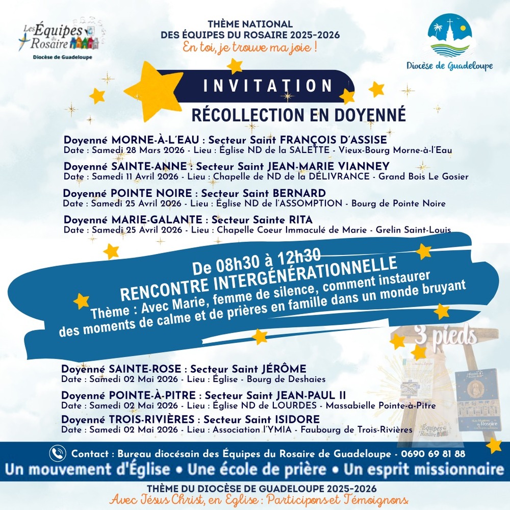 Les équipes du Rosaire du diocèse de Guadeloupe organisent donc cette année, des récollections en Doyenné. Elles ont débuté le 28 mars dernier, à l’église Notre-Dame de la Salette, à Vieux-Bourg Morne-à-l’Eau et se poursuivront jusqu’au 2 mai prochain. Ces récollections se déroulent de 8h30 à 12h30 sous la forme d’une rencontre intergénérationnelle autour du thème : Avec Marie, femme de silence, comment instaurer des moments de calme et de prières en famille dans un monde bruyant. Ces temps forts se déclineront ainsi par secteur de notre diocèse jusqu’au début du mois prochain. Voir le programme détaillé ci-dessous.