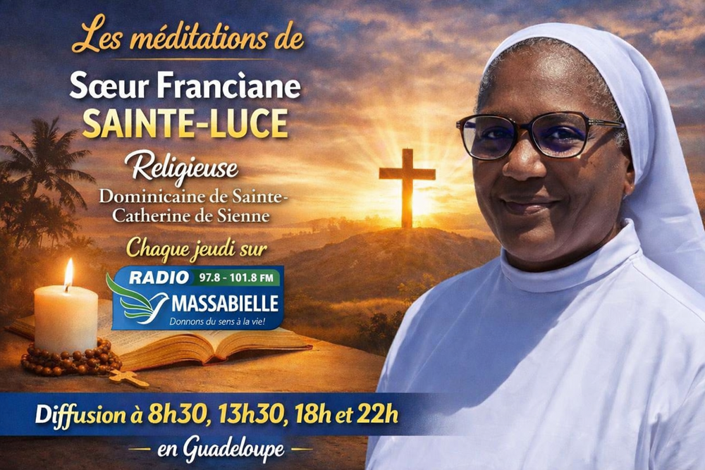 C’est ainsi que la radio diocésaine annonce le lancement à compter du jeudi 23 avril 2026, d’une autre rubrique : « Les méditations de Sœur Franciane SAINTE-LUCE », religieuse de la congrégation des Sœurs Dominicaines de l’ordre de Sainte Catherine de Sienne, présente en Guadeloupe. Sœur Franciane est par ailleurs chargée du service diocésain de la catéchèse et du catéchuménat. Elle nous proposera ses enseignements chaque jeudi sur les antennes de Radio Massabielle. Cette rubrique sera programmée ce jour-là en premières diffusions à 8h30, 13h30, 18h30 et 22h, puis, proposées ensuite en replay les jours suivants, de manière aléatoire de jour comme de nuit, pour aller rejoindre les auditeurs dans d’autres créneaux.