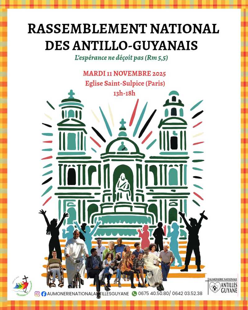 L’Aumônerie Nationale Antilles-Guyane organise comme chaque année son grand rassemblement national, qui se tiendra le mardi 11 novembre 2025 en l’église Saint-Sulpice de Paris. Depuis vingt-cinq ans, ce rendez-vous rassemble les voix, les mémoires et les parcours des Antillo-Guyanais qui vivent, travaillent ou étudient en France hexagonale, dans un élan de transmission, de valorisation et de dialogue entre les cultures et les générations. L’édition de cette année revêt une dimension particulière, avec l’accueil d’une délégation de La Réunion, accompagnée de son évêque, Monseigneur Pascal Chane-Teng, aux côtés des évêques de la Province ecclésiastique des Antilles-Guyane. Ce moment fort, célèbre les cultures antillo-guyanaises dans toute leur richesse et leur diversité en faisant rayonner nos territoires, nos mémoires et nos engagements. Le programme de ce temps de rencontre conviviale et fédératrice est le suivant. De 15h00 à 17h00 : Messe solennelle présidée par Monseigneur Alain Ransay, évêque de Guyane, entouré des évêques de la Province ecclésiastique des Antilles-Guyane et de La Réunion.