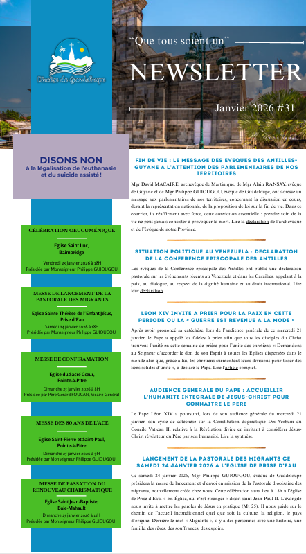 La newsletter du diocèse aux fidèles pour tout savoir de l'actualité et des temps forts de l'Eglise catholique en Guadeloupe.